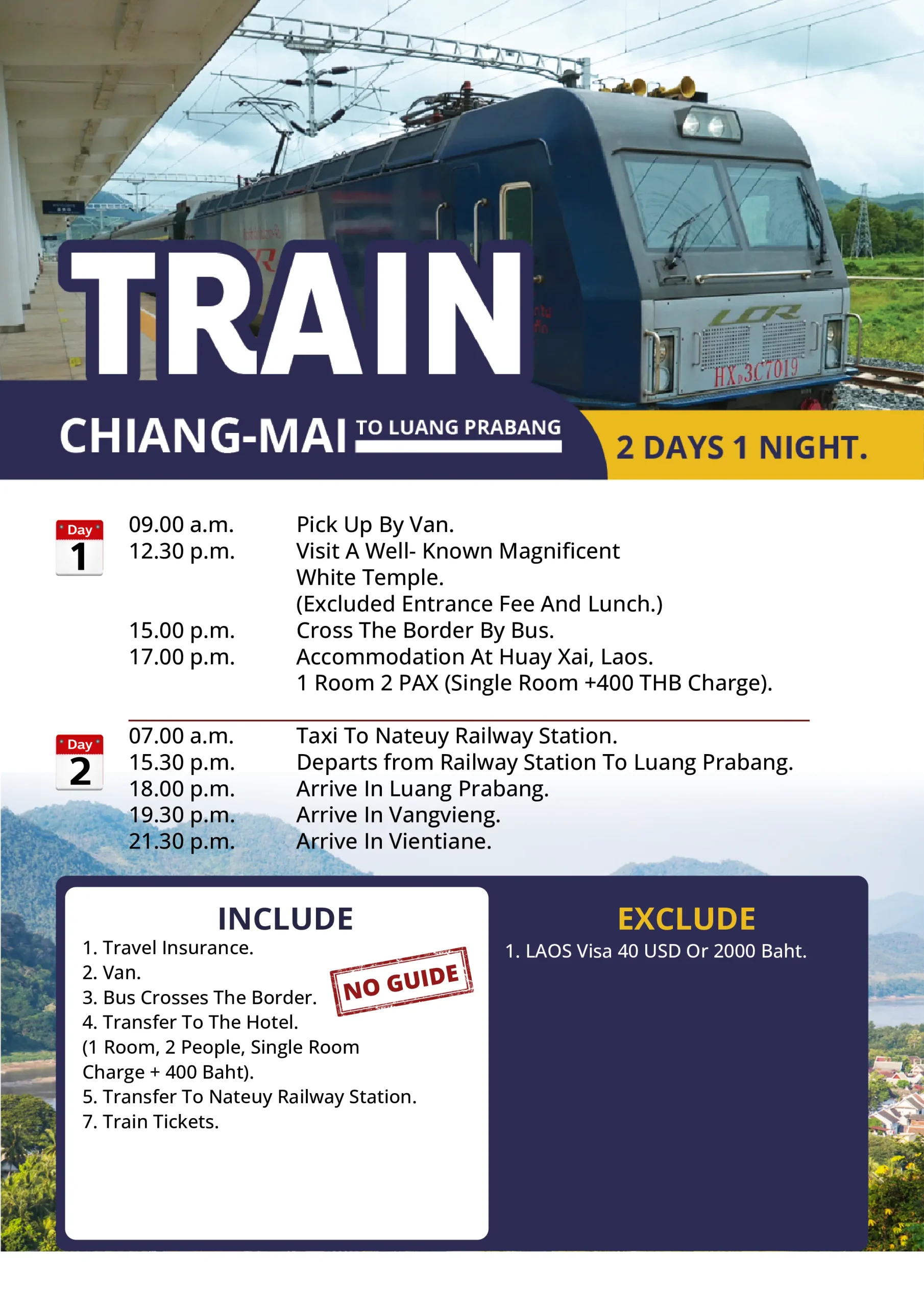 TRAIN CHIANG MAI TO LUANG PRABANG 2 DAYS 1 NIGHTBy admin / June 2, 2025 Package Price To Luang Prabang 2,650 THB/PERSON To Vang Vieng 2,950 THB/PERSON To Vientiane 3,100 THB/PERSON Contact Now